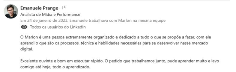 "Marlon se mostrou atento com minhas dores e seu extenso leque de conhecimentos foram essenciais pra me ajudar a encontrar soluções eficazes."