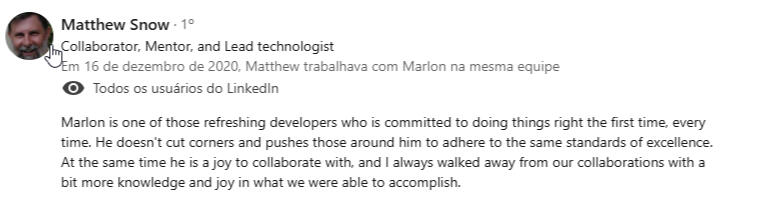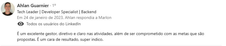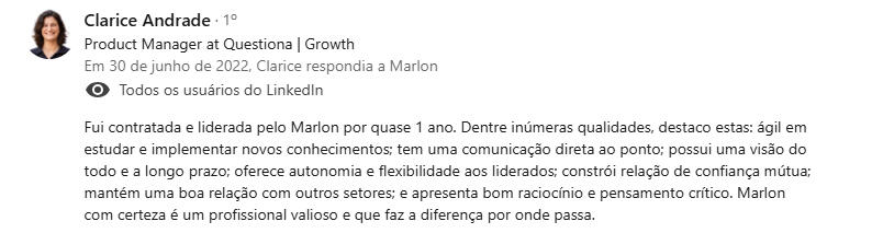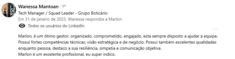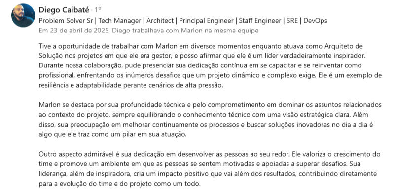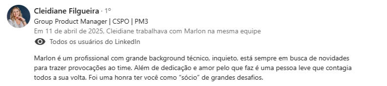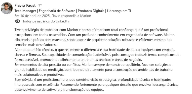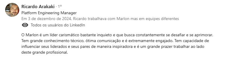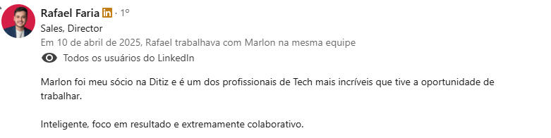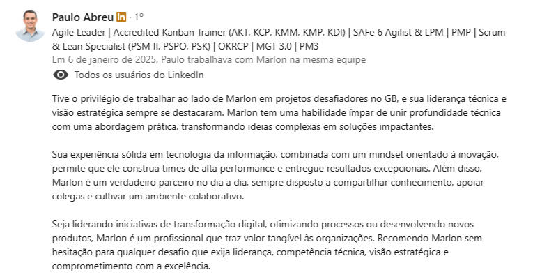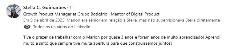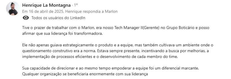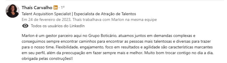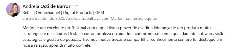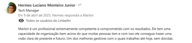 "Encontrei na mentoria com o Marlon uma verdadeira conexão entre propósito, experiência e ação - saí com clareza, foco e um plano concreto para evoluir como líder e profissional."
